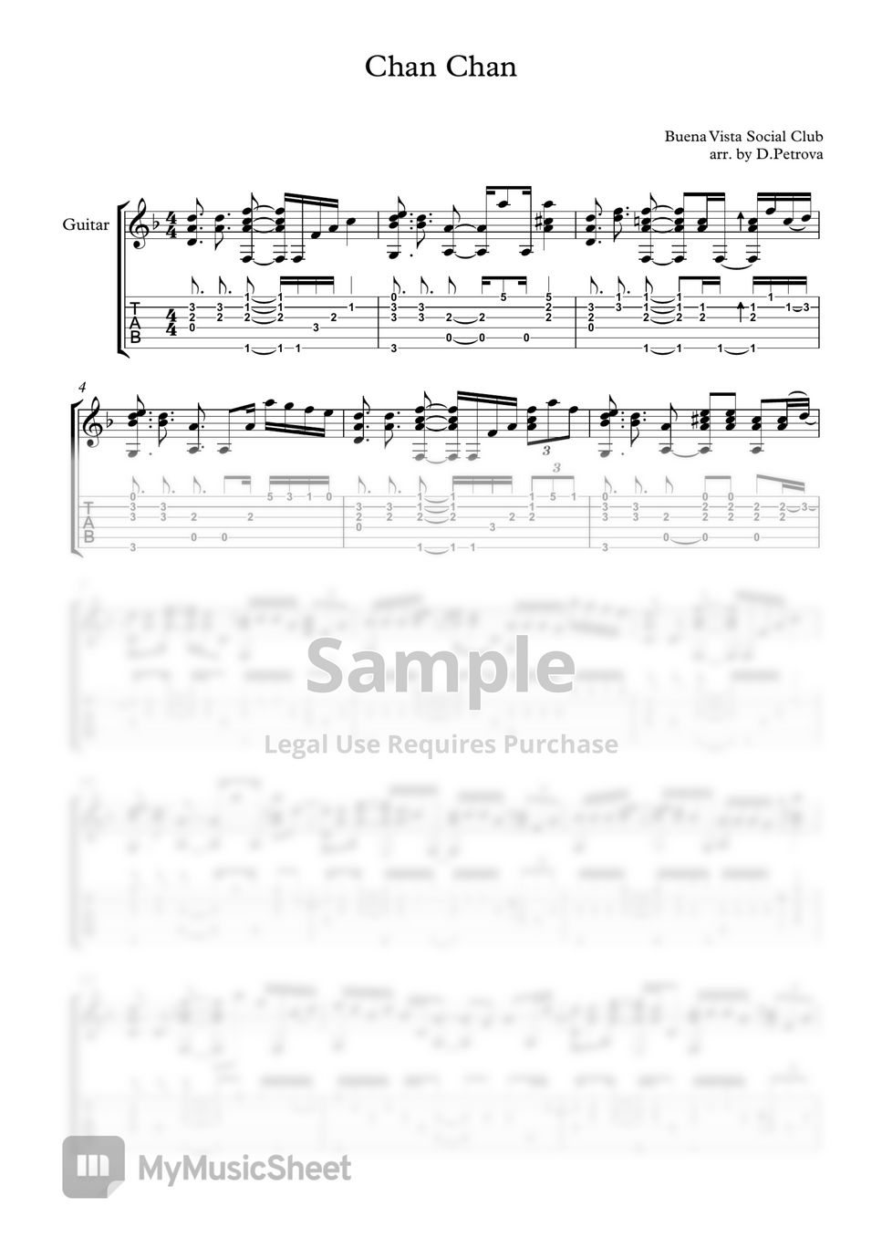 Buena Vista Social Club "Chan Chan" guitar tab pdf file. An accurate, fingerstyle version of Chan Chan arranged for solo guitar includes sheet music. Original key D minor, no capo, and standard tuning. Suitable for intermediate guitar players.