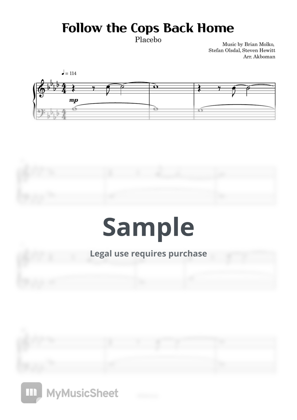 Music by Placebo, arranged for easy piano.