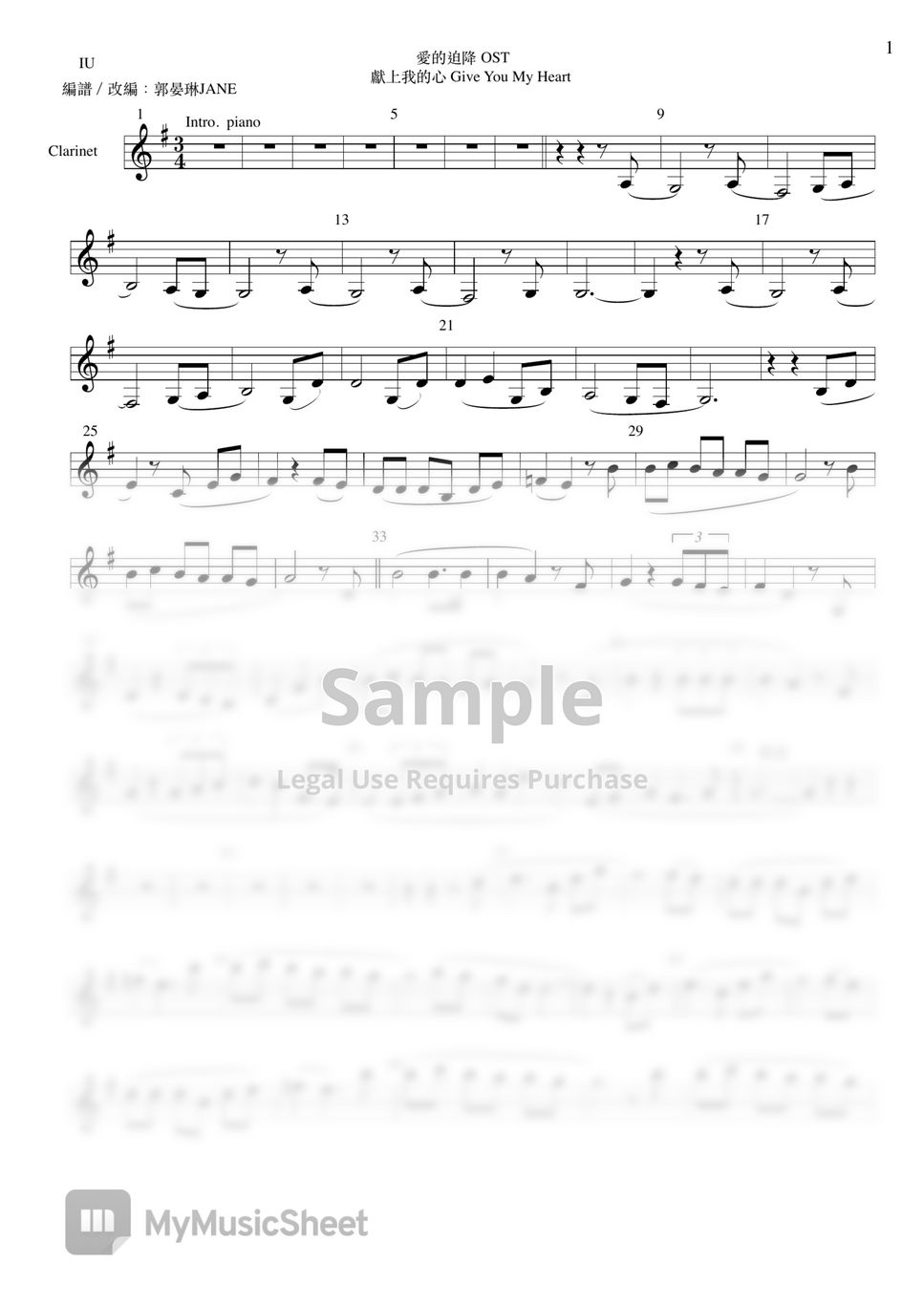 獻上我的心 Give You My Heart (clarinet sheet) IU