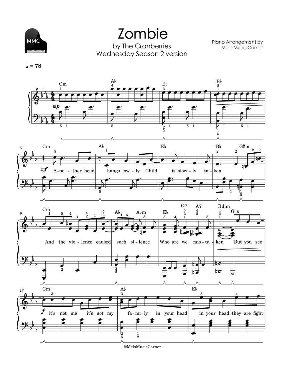 Zombie (Wednesday Season 2 version) (piano sheet music) The Cranberries