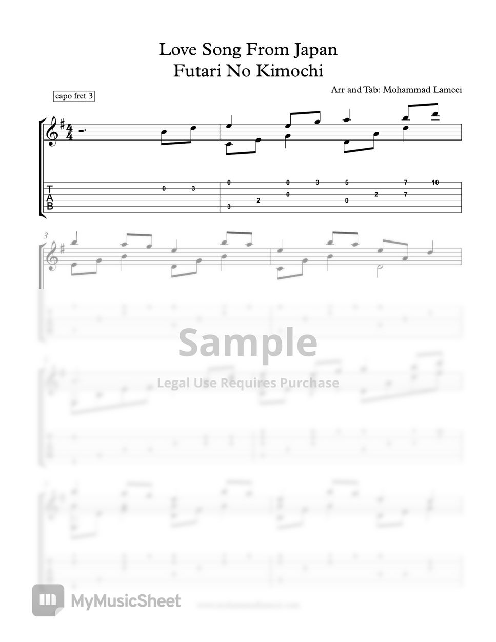 Embrace the captivating sounds of "Futari no kimochi", for the very first time now available in sheet music format! Expertly arranged by the talented Mohammad Lameei, this iconic animation track has been transcribed for acoustic-guitar enthusiasts. This sheet music is of normal difficulty, an excellent fit if you're all about embracing new challenges. Perfect for solo playing, it paves the way for you to be the standout performer. Let your musicality shine bright, claim your "Futari no kimochi" sheet music today and create your own magical rendition!