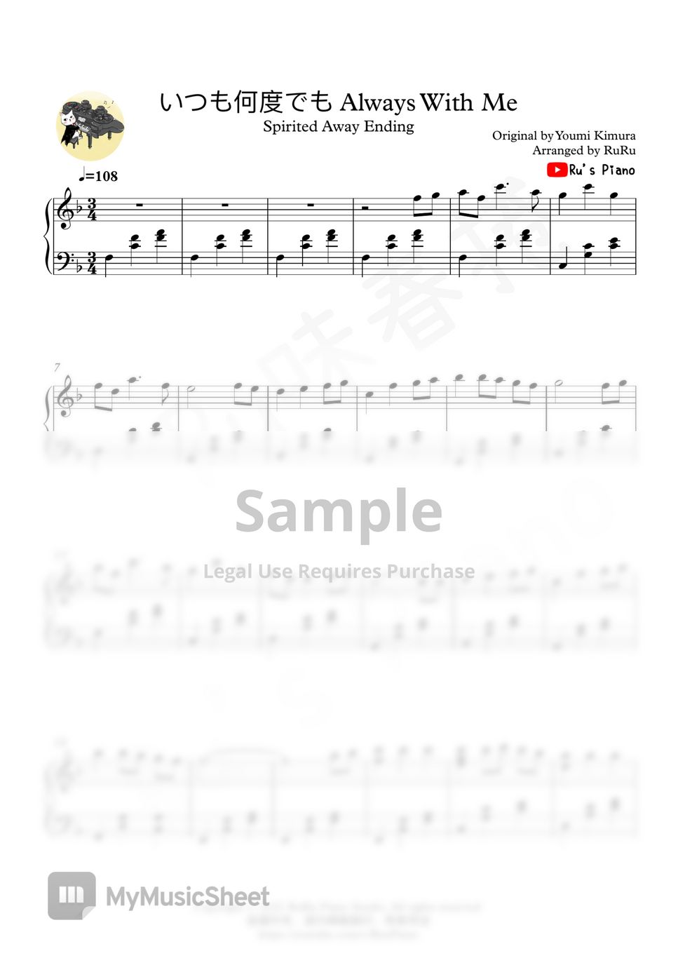 This is the Sheet Music PDF of Ru's piano cover “神隱少女Spirited Away - いつも何度でも Always with Me”